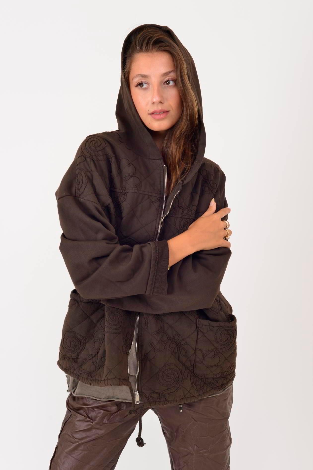 25140 Sarmaşık Çiçek Kabartmalı Kapüşonlu Fermuarlı Mont