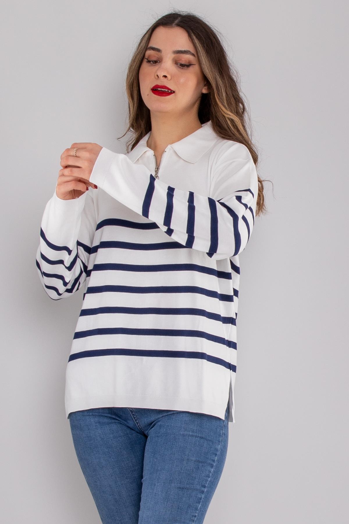 760 Polo Yaka Fermuar ve Çizgili Merserize Kadın Triko